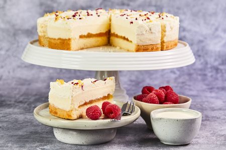 Peaches & Cream Torte (14 portions) comprises a layer of Victoria sponge, topped with peach compote and a creamy vanilla flavoured cheesecake. It is finished with freeze-dried raspberries and peach pieces.